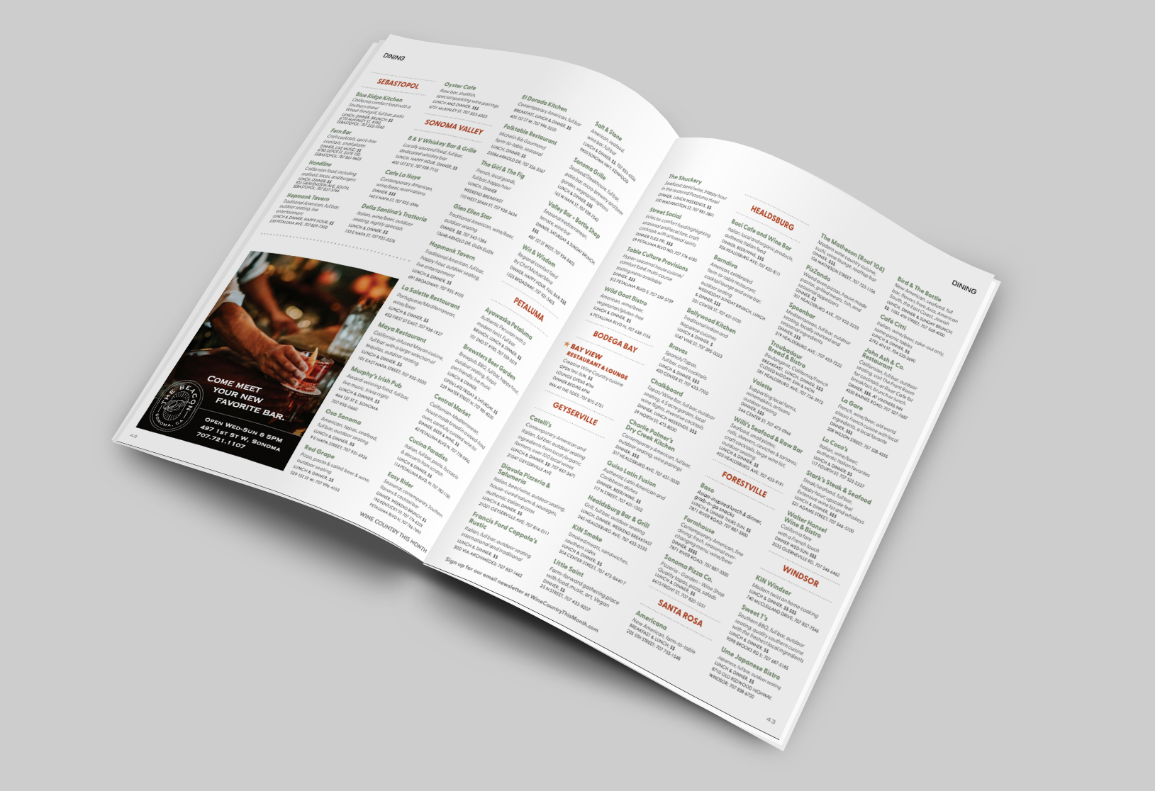 Working with the photos from their talented photographer, I created business cards and anĀ ad for Wine Country This Month magazine.
